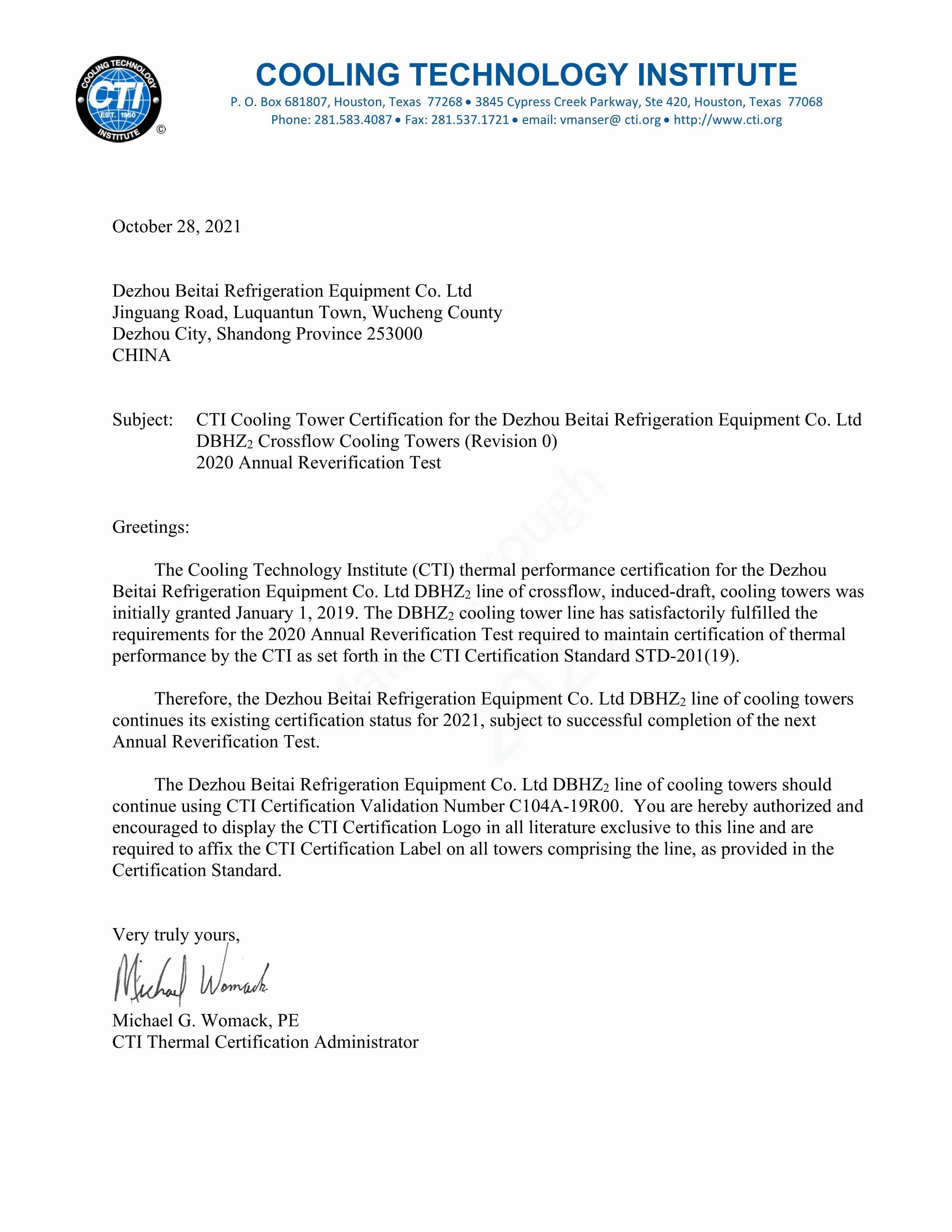 貝泰制冷新國際CTI認證檢測已通過!!